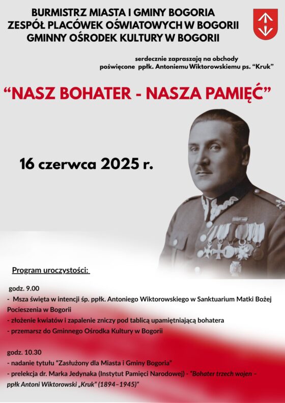 Burmistrz Miasta i Gminy Bogoria, Zespół Placówek Oświatowych w Bogorii oraz Gminny Ośrodek Kultury w Bogorii zapraszają na obchody poświęcone ppłk. Antoniemu Wiktorowskiemu „Krukowi”. Uczcijmy wspólnie dowódcę 2. Pułku Piechoty Legionów Armii Krajowej.